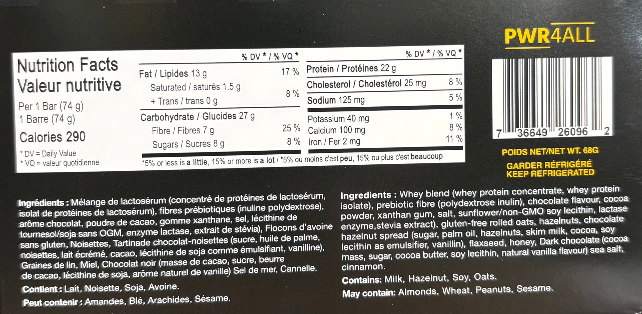 Complete with 21 grams of protein, Omega-3's, fibre, and healthy fats from nuts and coconut, PWR4ALL almond chocolate will be a staple in your fridge and your gym bag!