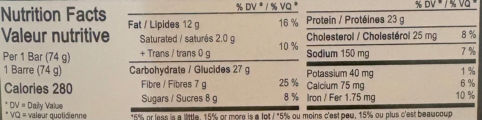 Ingredients: Whey blend (whey protein concentrate, whey protein isolate), prebiotic fibre (polydextrose inulin), chocolate flavour, cocoa powder, xanthan gum, salt, sunflower/non-GMO soy lecithin, lactase enzyme, stevia extract, gluten-free rolled oats, natural peanut butter, flaxseed, honey, dark chocolate (cocoa mass, sugar, cocoa butter, soy lecithin, natural vanilla flavour), sea salt, cinnamon.
