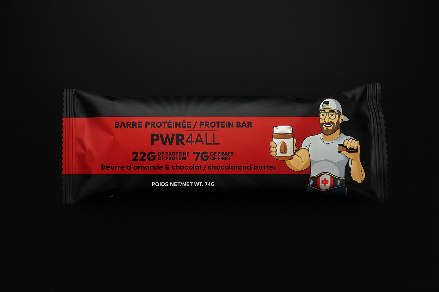 Un mélange de barres PWR4ALL (4 de chaque saveur) chocolat, beurre d’arachide, chocolat amande et chocolat noisette, ou vous pouvez combiner deux saveurs de votre choix.